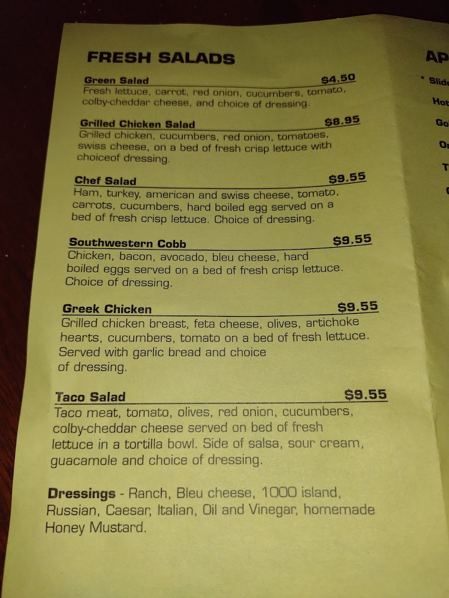- Fresh Salads: For lighter or healthier options, the menu includes Green Salad, Grilled Chicken Salad, Chef Salad, Southwestern Cobb, Greek Chicken, and Taco Salad. These selections accommodate customers looking for a salad-based meal.